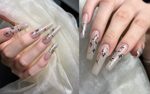 2. 竹影绘制:用细头拉线笔蘸甲油胶,勾勒竹干轮廓,线条要流畅有弧度,体现竹的柔韧;再画竹枝,分枝自然,长短错落;最后用黑色甲油胶点画竹叶,注意疏密有致,还原竹叶的舒展形态。